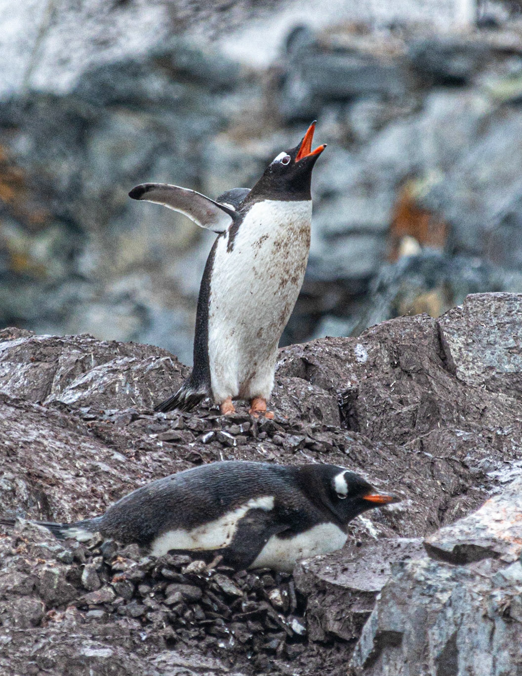 Penguin warming eggs on a nest of rock